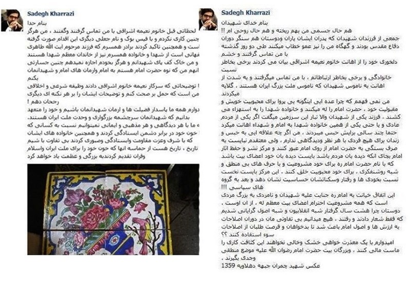 به گزارش خبرنگار گروه "رسانههای دیگر" خبرگزاری تسنیم، دکتر صادق خرازی سفیر سابق ایران در سازمان ملل و از مشاوران سید محمد خاتمی با انتقاد شدید از اهانت به خانواده ای شهدا خواستار برخورد و موضع جدی موسسه تنظیم و نشر آثار امام در برابر این بی حرمتی شد. صادق خرازی به واسطه ازدواج فرزندش با فرزند زهرا اشراقی از بستگان سببی نعیمه اشراقی است.