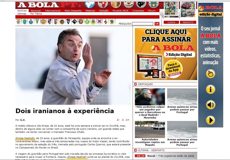 به گزارش خبرگزاری تسنیم، سایت پرتغالی آبولا خبر داد 2 بازیکن ایرانی برای حضور در تیم کویلیا در تمرینات این تیم شرکت کردهاند تا تست بدهند. یکی از این بازیکنان هافبک 20 سالهای است که نامی از او برده نشده و بازیکن دیگر نیز علیرضا حقیقی دروازهبان تیم روبین کازان است که میخواهد نظر فرانسیسکو چالو سرمربی این تیم را جلب کند.