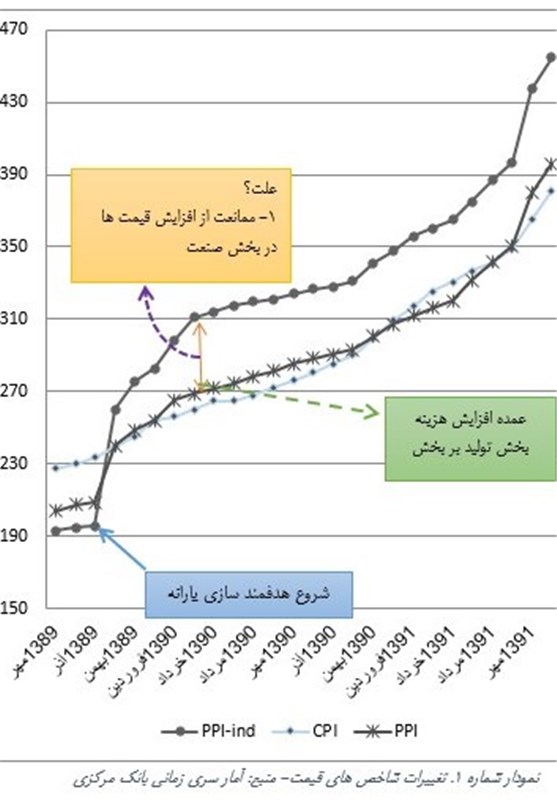 همانطور که در نمودار شماره 1 دیده می شود، بعد از هدفمندی یارانه ها بخش صنعت بیشترین رشد را به جهت هزینه های تولیدی داشته است. بخشی از این رشد ناشی از عدم تخصیص یارانه لازم به بخش تولید و بخش دیگر به تشدید تحریم ها و همچنین عدم تامین برخی ملزومات مورد نیاز تولید و در نتیجه، تامین آن با روش های هزینه بر، مربوط است. به عبارت دیگر آنچنانکه در نمودار نیز قابل رویت می باشد، آزاد سازی قیمت ها و حذف یارانه ها در دی ماه 1389 منجر به بروز یک شوک قیمتی در هزینه های بخش های تولیدی گشته است که البته با مشکلات ناشی از تحریم نیز بی ارتباط نیست.