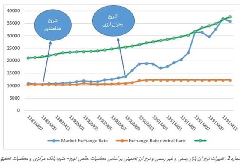 علت اینکه سال 79 به عنوان سال پایه در نظر گرفته شده، بروز بحران ارزی مشابه در آن سال است که در نتیجه آن فنر فشرده شده نرخ ارز آزاد گردید و پس از چندی با یکسان سازی نرخ ارز، نرخ بازار رسمی و غیر رسمی برابر شد. در نمودار شماره 2، نرخ ارز بازار رسمی و غیر رسمی و همچنین نرخ ارز برآورد شده بر اساس تعدیل خالص تورم آورده شده است. همانطور که ملاحظه می شود، نرخ ارز بازار غیررسمی در اواخر سال 91 با نرخ برآورد شده همخوانی داشته و نشان می دهد که متغیر تورم در کنار سایر متغیرهای ملتهب کننده بازار ارز، نقش اساسی در بروز بحران ارزی داشته است.