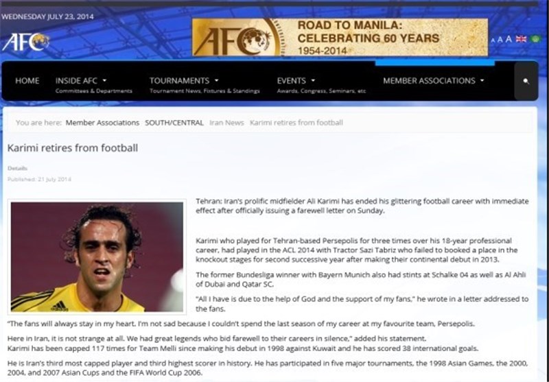 به گزارش خبرگزاری تسنیم، سایت کنفدراسیون فوتبال آسیا (AFC) در تمجید از علی کریمی که چند روز پیش کفشهایش را آویزان کرد، نوشت: هافبک طراز اول تیم ملی ایران با نوشتن نامهای برای هوادارانش به دوران درخشان بازیگری خود پایان داد.