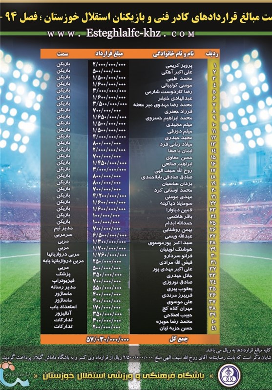 با توجه به تاکید سازمان لیگ بر‌تر و به منظور شفاف سازی و اطلاع عموم مردم فهیم و ورزش دوست کشور عزیزمان ایران و زدودن جو شایعات پیرامون انعقاد قراردادهای نجومی، بدین وسیله باشگاه فرهنگی و ورزشی استقلال خوزستان به عنوان یکی از پیشگامان شفاف سازی و حمایت از این حرکت ارزشمند، اقدام به انتشار لیست مبالغ کادر فنی و بازیکنان خود به شرح ذیل می‌کند: