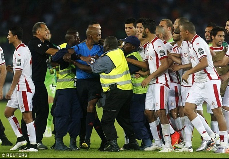به گزارش خبرگزاری تسنیم، تیمهای ملی فوتبال گینه استوایی و تونس شنبه شب در مرحله یک چهارم نهایی جام ملتهای 2015 آفریقا به مصاف هم رفتند. گینه در این بازی با نتیجه 2 بر یک از سد حریفش گذشت ولی پیش از اینکه سوت پایان به صدا در بیاید بازیکنان تونس که به شدت از تصمیم داور برای پنالتی مشکوکی که به سود گینه استوایی در دقیقه 3+90 اعلام کرد، معترض بودند به سمت او حمله کردند و پس از درگیری بازیکنان و مربیان دو تیم پلیس ضدشورش وارد ماجرا شد و با ایجاد امنیت برای داور مسابقه، به درگیری بازیکنان دو تیم خاتمه داد.