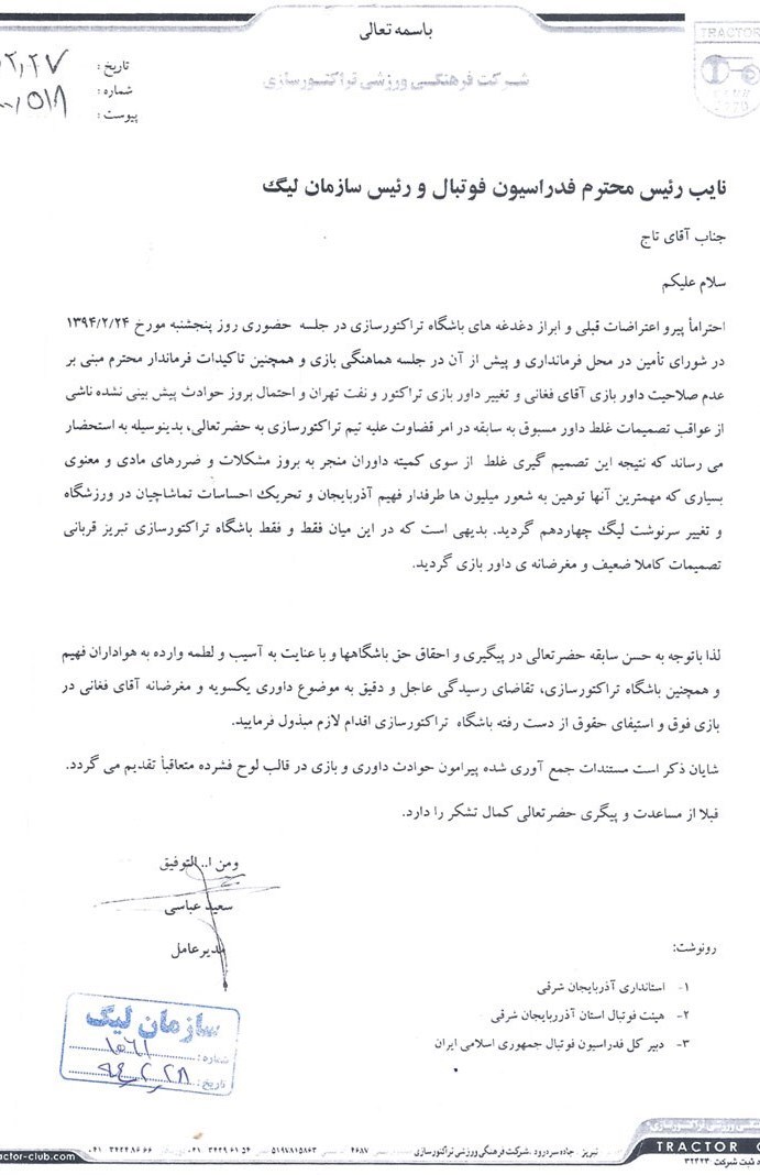 متن کامل نامه باشگاه تراکتور سازی به شرح ذیل است: