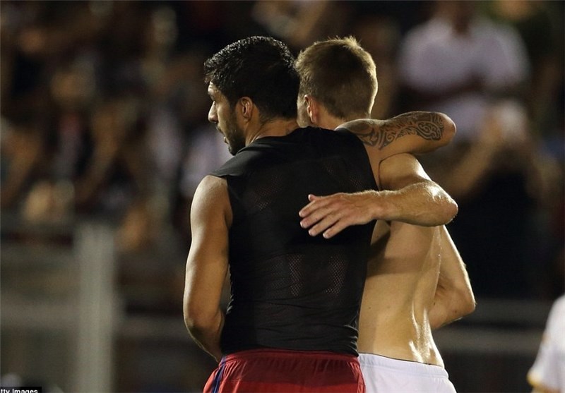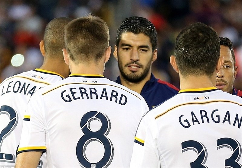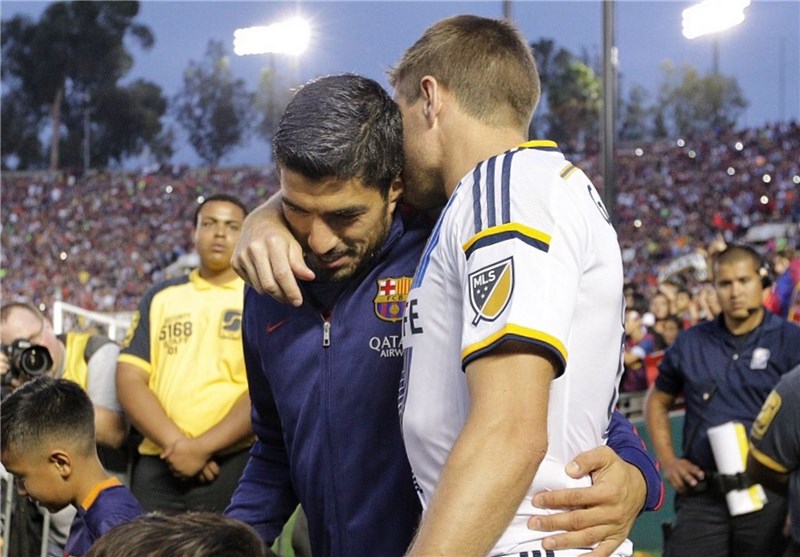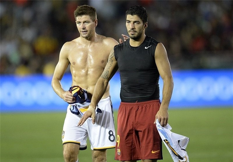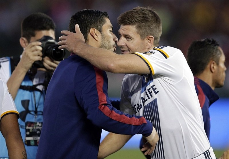 به گزارش خبرگزاری تسنیم، پیش از آغاز دیدار دو تیم بارسلونای اسپانیا و لسآنجلس گلکسی آمریکا که امروز (چهارشنبه) در ورزشگاه «رز باول» شهر پاسادنای کالیفرنیا برگزار شد، لوئیز سوارز، مهاجم اروگوئهای بارسلونا و استیون جرارد، هافبک انگلیسی لسآنجلس که به مدت چهار فصل در کنار یکدیگر در لیورپول بازی کرده بودند، با هم روبهرو شدند.