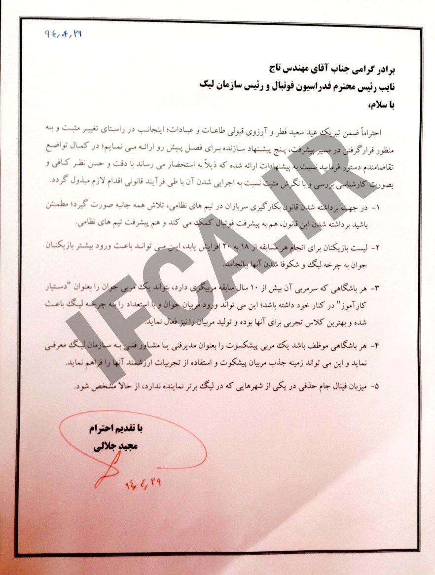 بهگزارش خبرگزاری تسنیم و به نقل از سایت رسمی کانون مربیان فوتبال ایران(ifca.ir)، مجید جلالی با ارسال نامهای رسمی به مهدی تاج، رئیس سازمان لیگ پنج پیشنهاد برای بالا رفتن کیفیت رقابتهای لیگ برتر ارائه کرد.