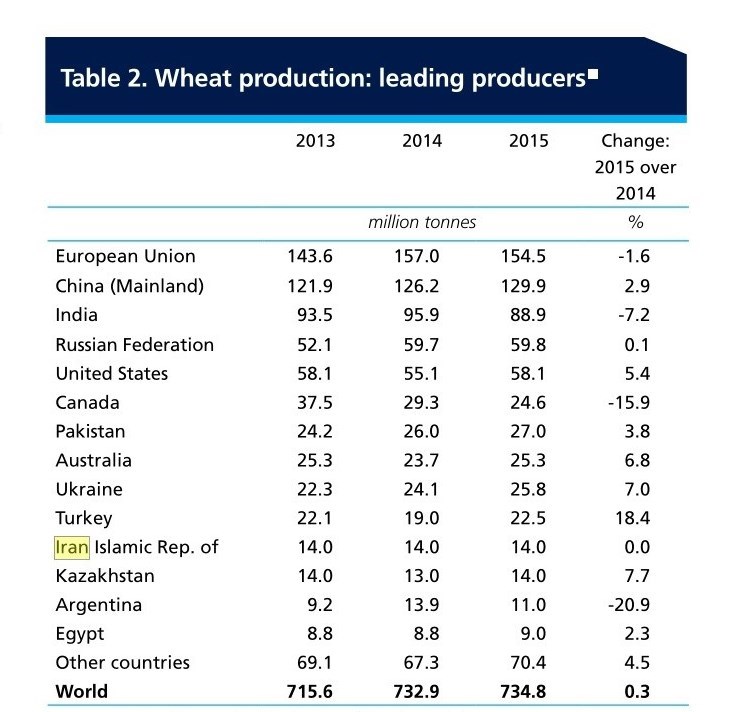 بر اساس این گزارش، ایران با تولید 14 میلیون تنی به همراه قزاقستان یازدهمین تولید کننده بزرگ گندم در جهان طی امسال شناخته شده است.