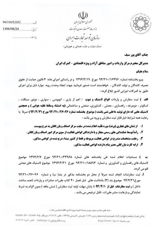 الف)ثبت سفارش و واردات انواع لاستیک و تیوپ: اعم از باری، اتوبوسی، سواری، موتورسیکلت، اسکوتر، دوچرخه، راهسازی، معدنی، کشاورزی، صنعتی و ساختمانی(به استثناء وسائط نقلیه هایی) و همچنین لاستیکهایی که دارای تولید داخلی نمیباشند(موضوع بخشنامه شماره 94/210/26026 مورخ 1394.04.31) صرفاً با رعایت همه شرایط ذیل قابل ثبت سفارش و ورود میباشد: