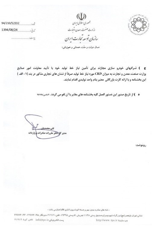 ج) شرکتهای خودروسازی مجازند برای تأمین نیاز خط تولید خود با تأیدی معاونت امور صنایع وزارت صنعت، معدن و تجارت به میزا CKD مورد نیاز خط تولید صرفاً از نشانهای تجاری مذکور در بند (1-الف) این بخشنامه و با ارائه کارت بازرگانی معتبر بنام واحد تولیدی اقدام نمایند.