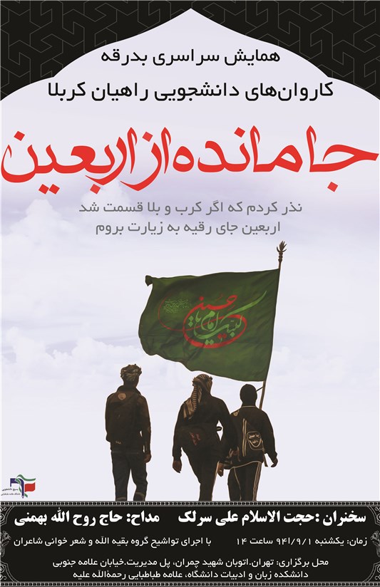 به گزارش خبرنگار گروه دانشگاه خبرگزاری تسنیم، همایش سراسری «جا مانده از اربعین» به همت بسیج دانشجویی دانشگاه علامه طباطبایی و به منظور گرامیداشت مقام حضرت رقیه(س) با بدرقه صدها نفر از دانشجویان کاروانهای دانشجویی راهیان کربلا برگزار میشود.