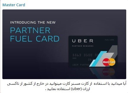 یکی از مهم ترین خدماتی که در این کانال تبلیغ شده، کارت اعتباری ارزی مسترکارت است. بنا بر آنچه از سوی کانال رسمی مسترکارت تبلیغ می شود، متقاضیان در ایران می توانند با ثبت نام دریافت کارت ارزی به کانال تلگرامی این شرکت ملحق شوند.
