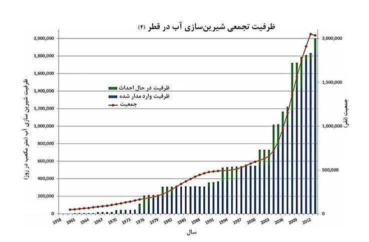 بر اساس آمارهای بانک جهانی این کشور در 10 سال اخیر به طور میانگین 13% رشد تولید ناخالص داخلی و 11% رشد جمعیت داشته است(2) و اگر تنها به منابع آبی تجدیدپذیر اکتفا میکرد در این مسیر با مشکلات زیادی روبهرو میشد. اما قطر با اتخاذ راهبردهای مناسب توانسته است بر این مشکل غلبه پیدا کند که مهمترین این راهبردها شیرینسازی آب دریا بوده است. مسئولان قطری از مزیت دسترسی به آبهای خلیج فارس استفاده کرده و توانستهاند با شیرینسازی این آب، 50% آب مورد نیاز این کشور را تأمین کنند.