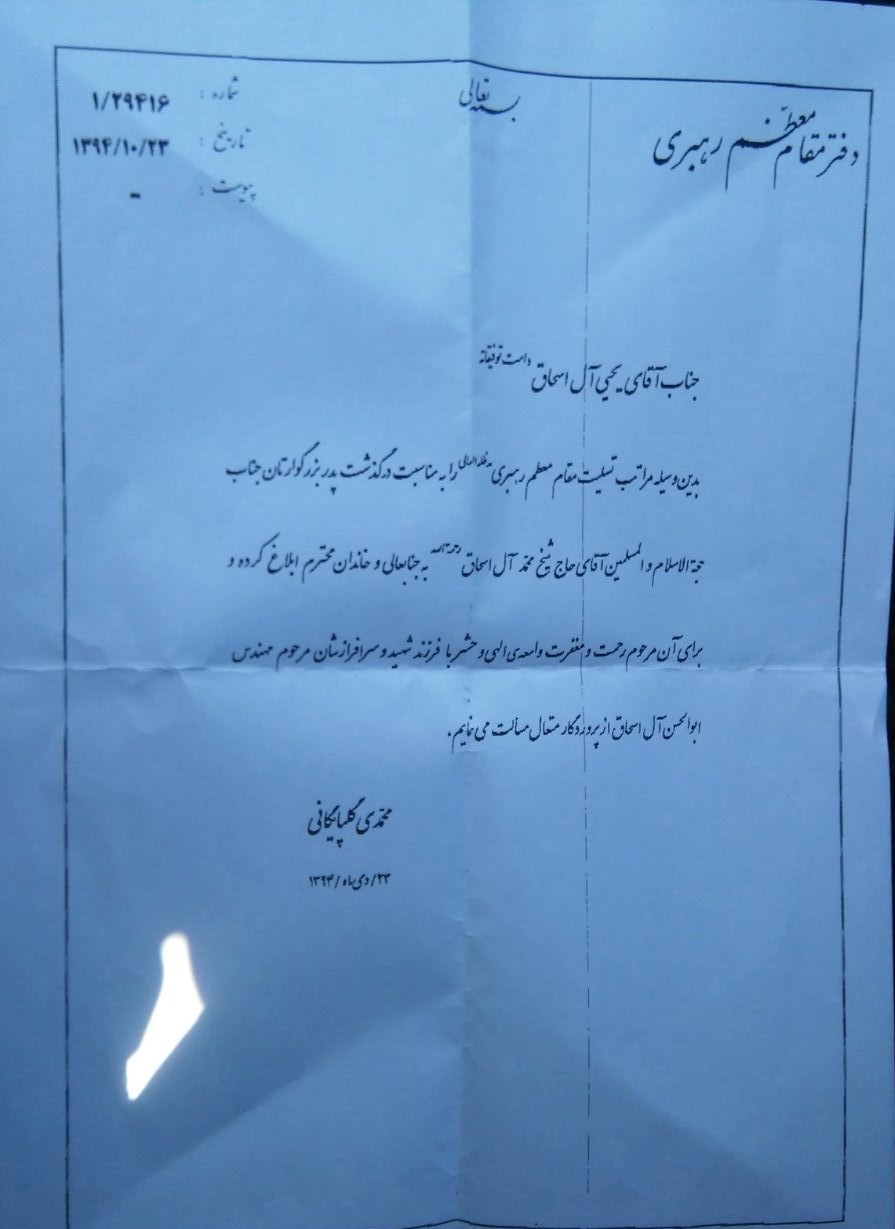 بدین وسیله مراتب تسلیت مقام معظم رهبری مد ظله العالی را بهمناسبت درگذشت پدر بزرگوارتان جناب حجت الاسلام و المسلمین حاج شیخ محمد آلاسحاق رحمه الله به جنابعالی و خاندان محترم ابلاغ کرده و برای آن مرحوم رحمت و مغفرت واسعه الهی و حشر با فرزند شهید و سرافرازشان مرحوم مهندس ابوالحسن آلاسحاق از پروردگار متعال مسئلت مینمایم.