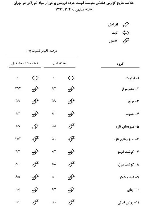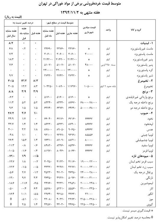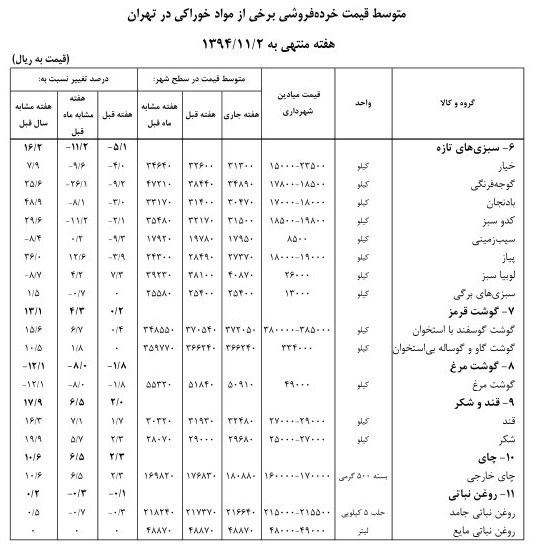 به گزارش خبرگزاری تسنیم، بانک مرکزی متوسط قیمت خرده فروشی برخی از مواد خوراکی در تهران در هفته منتهی به 2 / 11 / 1394 را منتشر کرد که بر اساس این گزارش قیمت 6گروه تخم مرغ، برنج، حبوب، گوشت قرمز، قند و شکر و چای نسبت به هفته قبل افزایش ، قیمت 4 گروه میوه های تازه، سبزی های تازه، گوشت مرغ و روغن نباتی کاهش یافته و قیمت گروه لبنیات نسبت به هفته قبل تغییری نداشته است.