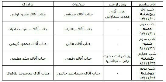 این مراسم از شب اول تا شب پنجم جمادیالثّانی برابر با پنجشنبه 94/12/20 تا دوشنبه 94/12/24 پس از نماز مغرب و عشاء، در حسینیه امام خمینی رحمهاللهعلیه واقع در تهران، خیابان فلسطین جنوبی، تقاطع آذربایجان بر پا خواهد بود. همچنین پیش از آغاز مراسم، حجتالاسلام فلاحزاده به بیان احکام شرعی خواهند پرداخت.