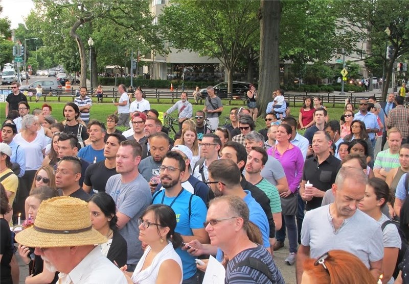 به گزارش خبرنگار خبرگزاری تسنیم در واشنگتن، بیش از 400 آمریکایی روز دوشنبه در پرترددترین میدان واشنگتن دی.سی در حمایت از کشته شدگان کلوپ شبانه اورلاندو تجمعی خاموش برپا کردند.