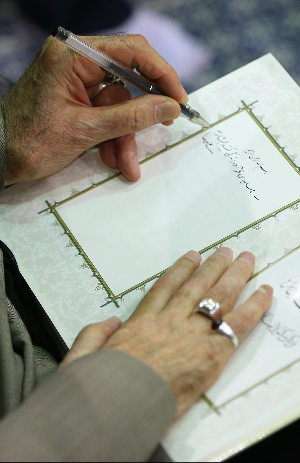 وی که پس از ایراد سخنانش مانند سایر دانشجویان برای مصافحه نزد رهبر انقلاب رفت، از ایشان درخواست دست نویسی می‌کند و  برگه خود را برای نوشتن دست‌خط مقابل حضرت آقا قرار می‌دهد. حضرت آقا نیز در پاسخ به درخواست این دانشجو جمله "در سایه قرآن زندگی کنید، ان‌شاءالله" را در صفحه اول قرآنی می‌نویسند و به او هدیه می‌کنند.