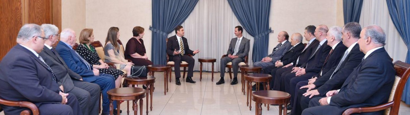 به گزارش گروه بین‌الملل خبرگزاری تسنیم، اعضای هیئت اتحادیه سازمان جوامع عربی به ریاست «سیدعزیز جرجو» با «بشار اسد» رئیس جمهور سوریه در دمشق دیدار کردند.