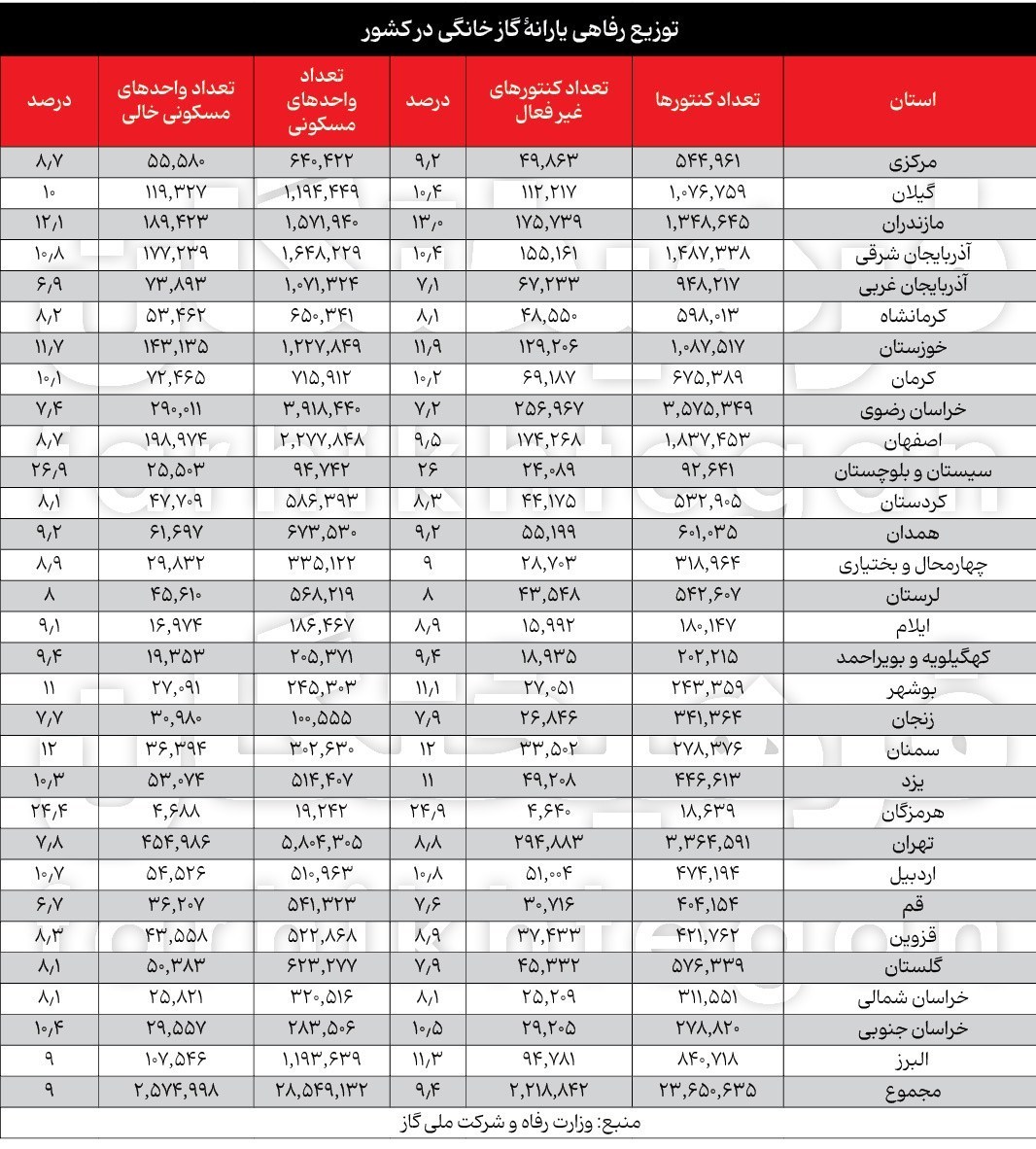 تازهترین آمارها از توزیع یارانه گاز خانگی در کشور نشان میدهد میزان واحدهای مسکونی خالی و تعداد کنتورهای فعال در استانها تفاوتهای قابلتوجهی دارد. بر اساس دادهها، استان سیستان و بلوچستان با 26.9 درصد واحدهای مسکونی خالی و نزدیک به 26 درصد کنتورهای خالی، بالاترین نرخ خالی بودن واحدها را در بین استانها دارد. پس از آن، استان هرمزگان با 24.4 درصد واحد مسکونی خالی و 24.9 درصد کنتور خالی قرار دارد.