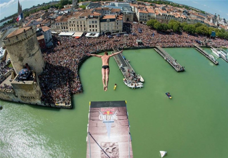 یک شیرجهزن روسی به نام آرتم سیلچنکو طی دومین دور مسابقت جهانی شیرجه از روی صخره «رد بل» که در لاروشه فرانسه برگزار میشود، از یک سکوی 27.5 متری بر فراز برج سنتنیکولاس به درون آب شیرجه میزند.