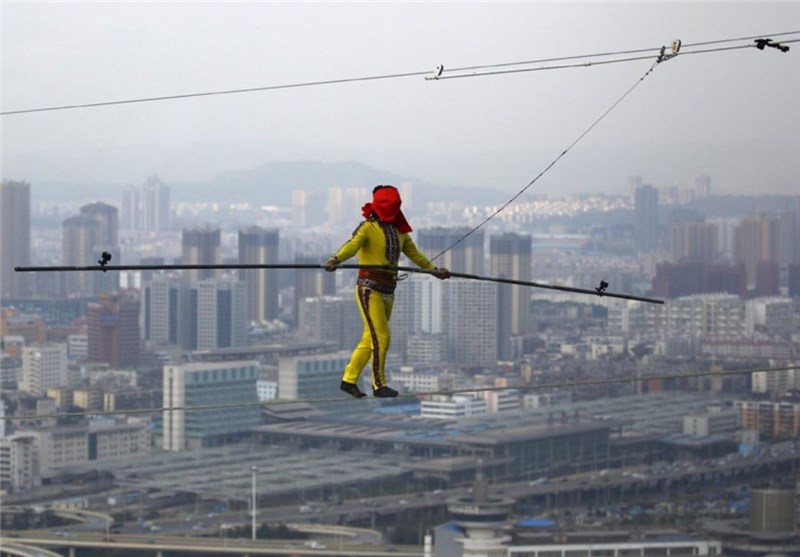 آیسیکایر ووبولیکسیمو، آکروباتباز 42 ساله اویغور طی رقابتهای موسوم به «چالش کونمینگ» در چین، در حالی که چشمان خود را با لباسی قرمز رنگ بسته بود، به صورت معکوس (عقبگرد) بر روی یک طناب در ارتفاع بسیار بالا حرکت میکند.