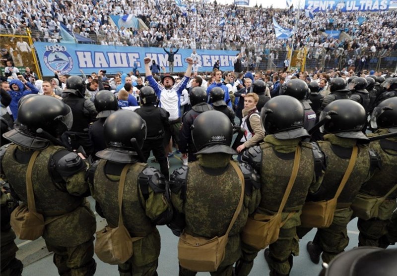 سربازان و افسران پلیس روسی در مقابل هواداران تیم فوتبال زنیت سنتپترزبوگ که پس از پیروزی بر تیم افسی یفا در ورزشگاه پتروفسکی سنتپترزبورگ در حال جشن و پایکوبی هستند، موضع گرفتهاند.