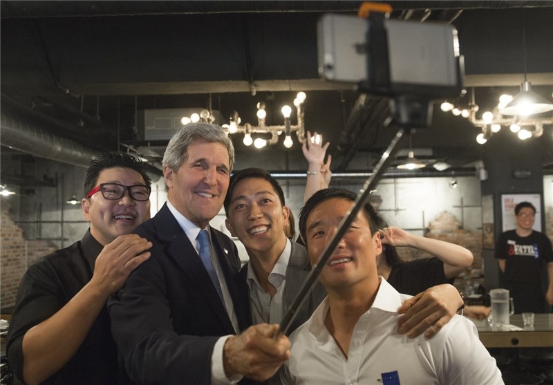 جان کری، وزیر خارجه آمریکا با به دست گرفتن یک «چوبچه» عکاسی سلفی، از خود و تعدادی از شهروندان کره جنوبی در یک رستوران در شهر سئول عکس میگیرد.