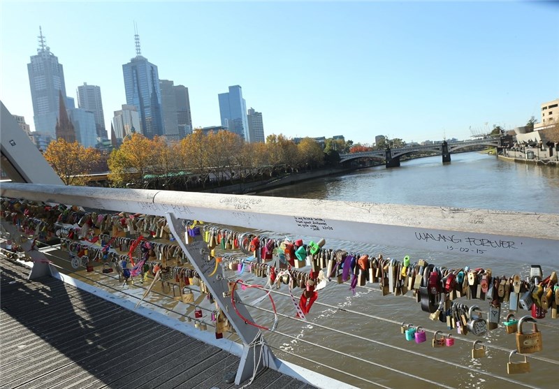 عشاق جوان استرالیایی، قفلهایی را به عنوان نماد عشق جاودان خود بر روی نردههای پیادهراه پل سوثگیت در شهر ملبورن نصب میکنند.
