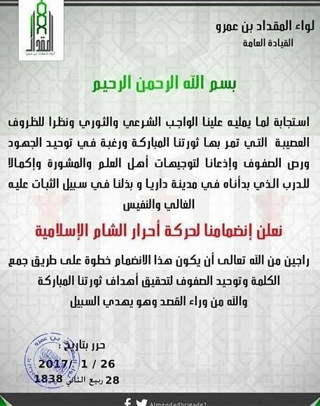 التطورات الميدانية المتسارعة وسقوط عشرات القتلى من الطرفين، دفع الفصائل المساندة لأحرار الشام وهي (ألوية صقور الشام – جيش الإسلام – كتائب ثوار الشام – الجبهة الشامية – جيش المجاهدين – تجمع فاستقم كما أمرت) إلى الاندماج ضمن تشكيل واحد لوضع حدِ لاعتداءات جبهة النصرة، حيث أصدر هذا التشكيل بياناً جاء فيه: "إن أي اعتداء على أبناء الحركة المنضمين لها أو مقراتها أو بمثابة إعلان قتال لن تتوانى حركة أحرار الشام في التصدي له وإيقافه مهما تطلب من قوة".