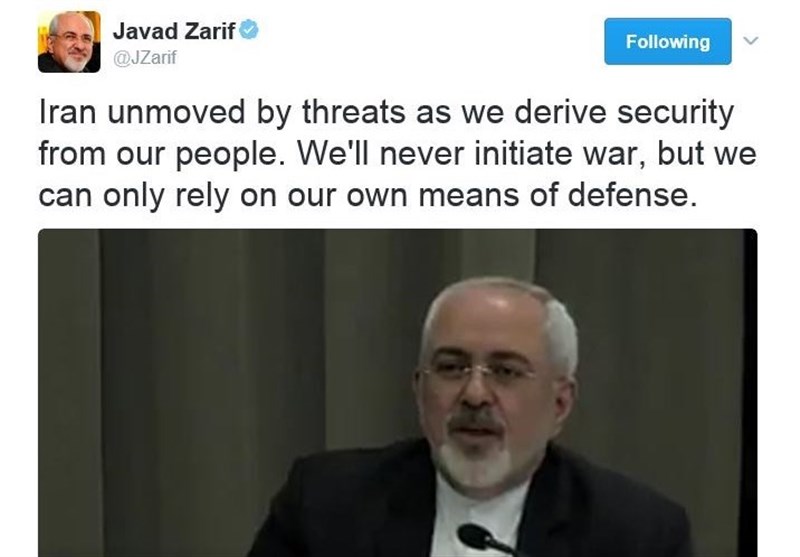 “Iran unmoved by threats as we derive security from our people,” Zarif said on his official twitter account on Friday.
