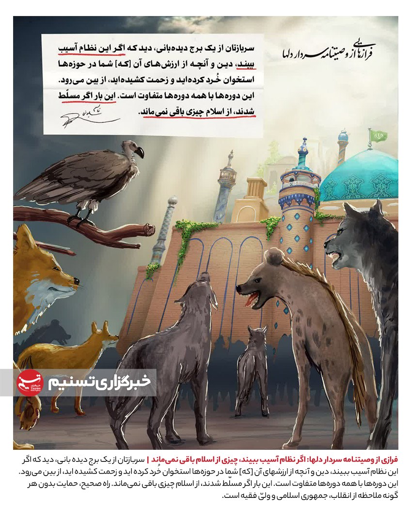 فرازی از وصیتنامه سردار دلها: اگر نظام آسیب ببیند، چیزی از اسلام باقی نمیماند | سربازتان از یک برج دیده بانی، دید که اگر این نظام آسیب ببیند، دین و آنچه از ارزشهای آن [که] شما در حوزهها استخوان خُرد کرده اید و زحمت کشیده اید، از بین میرود. این دورهها با همه دورهها متفاوت است. این بار اگر مسلّط شدند، از اسلام چیزی باقی نمیماند. راه صحیح، حمایت بدون هر گونه ملاحظه از انقلاب، جمهوری اسلامی و ولیّ فقیه است. / تصویرسازی: موسوی