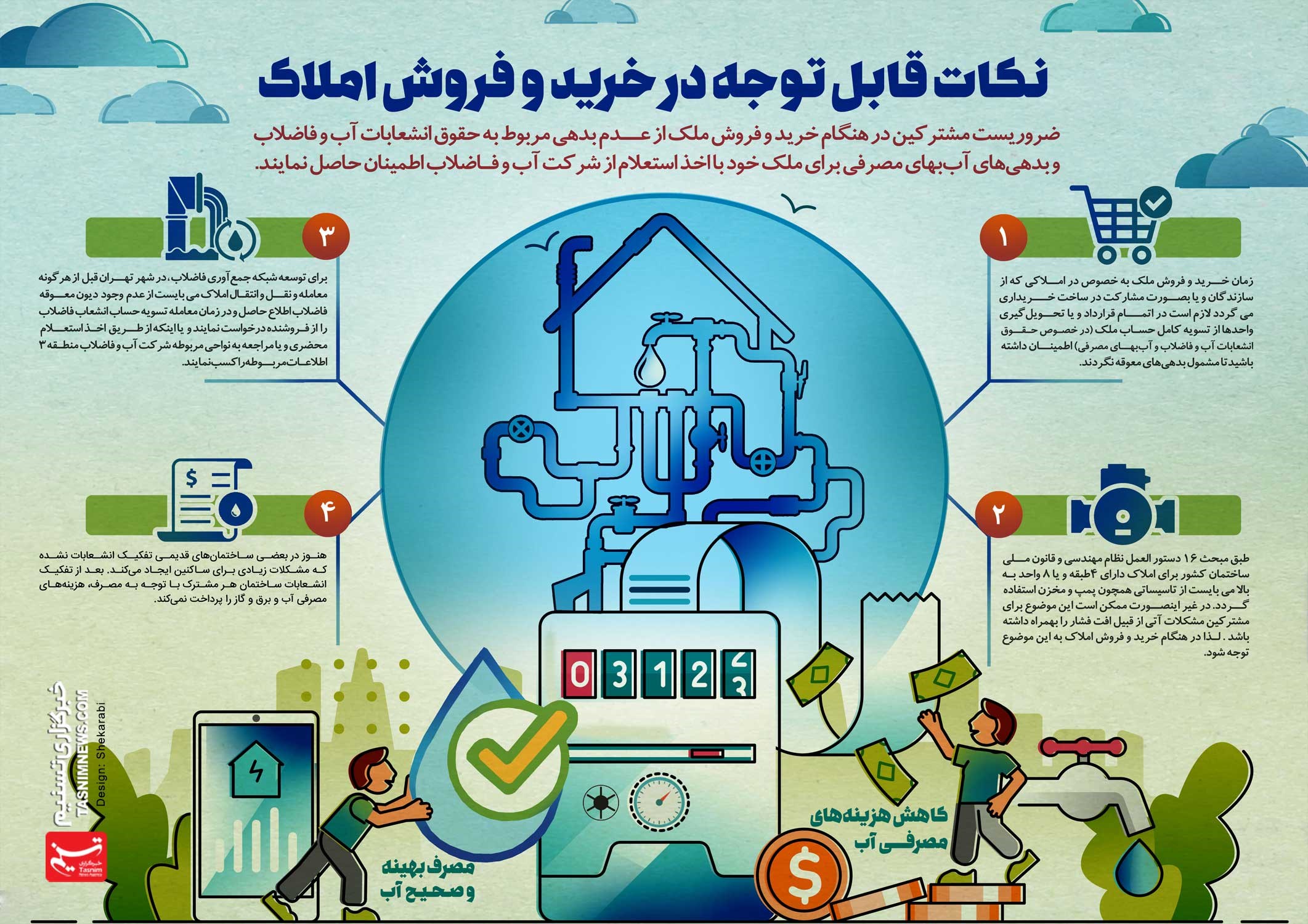 ضروریست مشترکین در هنگام خرید و فروش ملک از عدم بدهی مربوط به حقوق انشعابات آب و فاضلاب و بدهی‌های آب بهای مصرفی برای ملک خود بااخذ استعلام از شرکت آب و فاضلاب اطمینان حاصل نمایند.