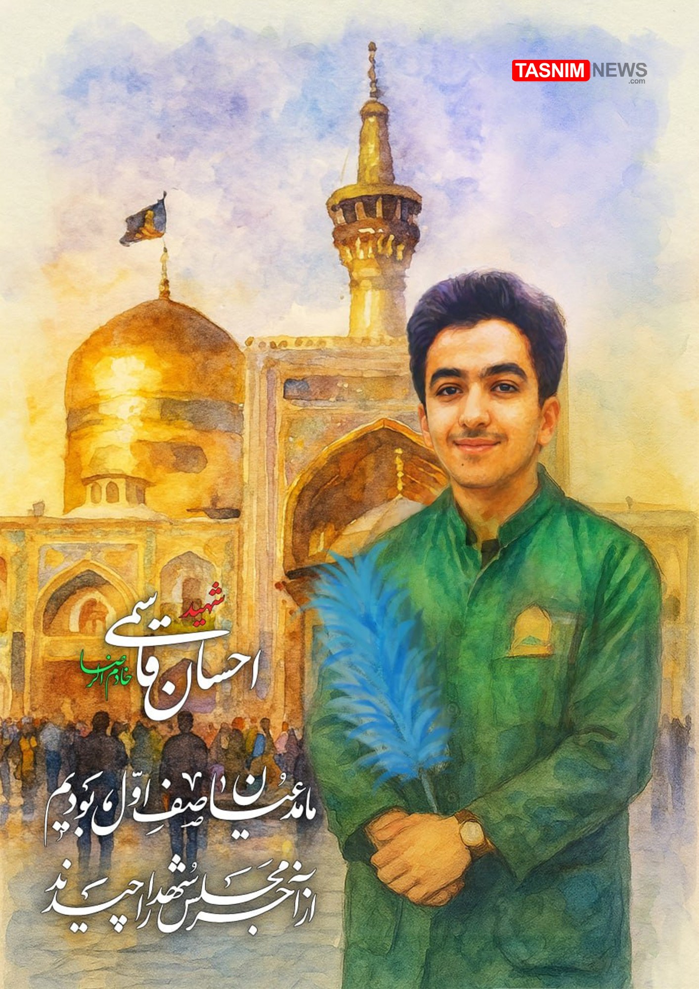 شهید «احسان قاسمی» در چایخانه امام رضا(ع) خامی میکرد و انس و الفت عجیبی با حضرت رضا (ع) داشت؛ رفقایش میگفتند وقتی شیفت خادمی شروع میشد دیگر او احسان نبود انگار پر میکشید و در آغوش امام رضا (ع) قرار میگرفت. شهید احسان قاسمی، نوجوان 16سالهای که در حمله رژیم صهیونیستی به یک واحد مسکونی در منطقه سالاریه قم به شهادت رسید.