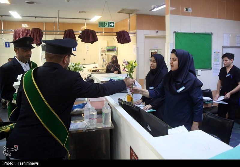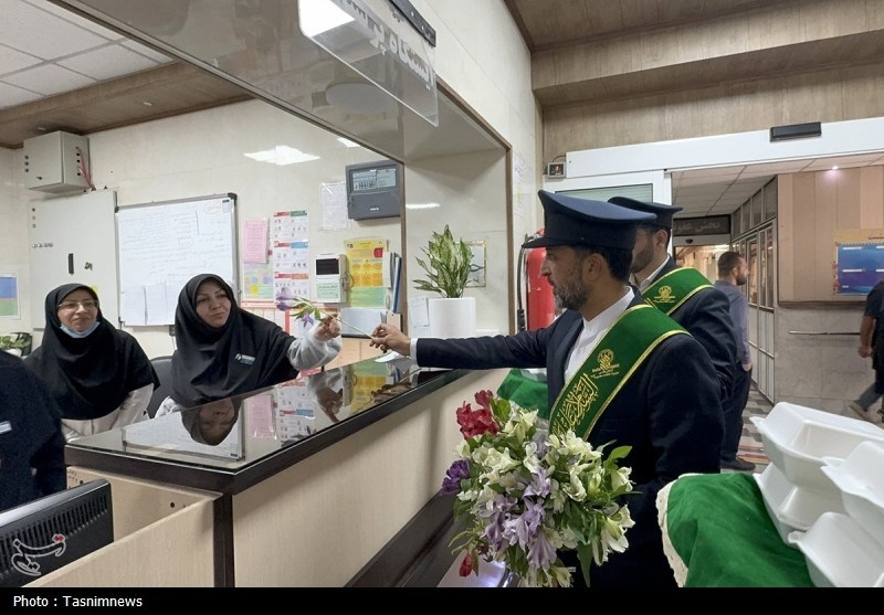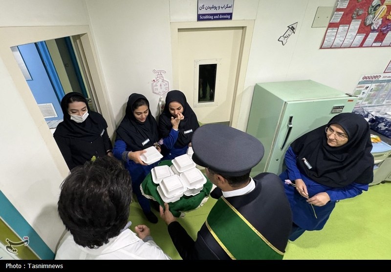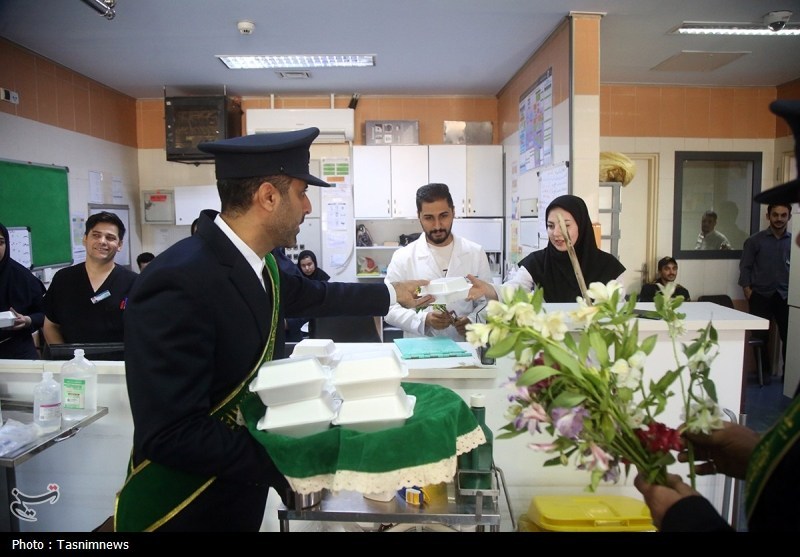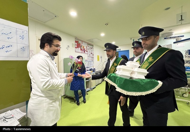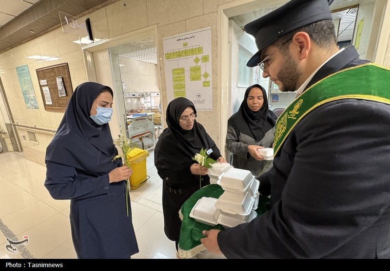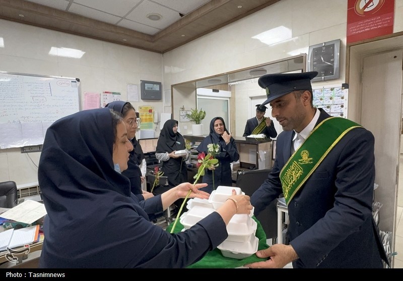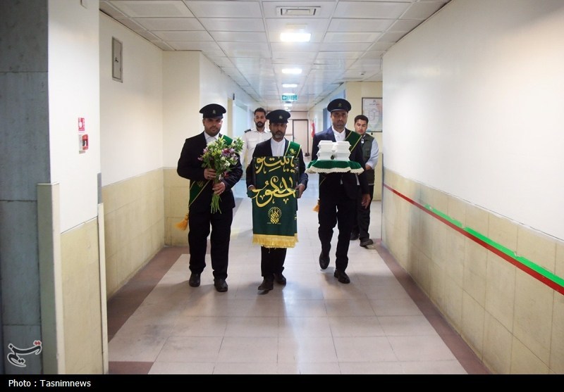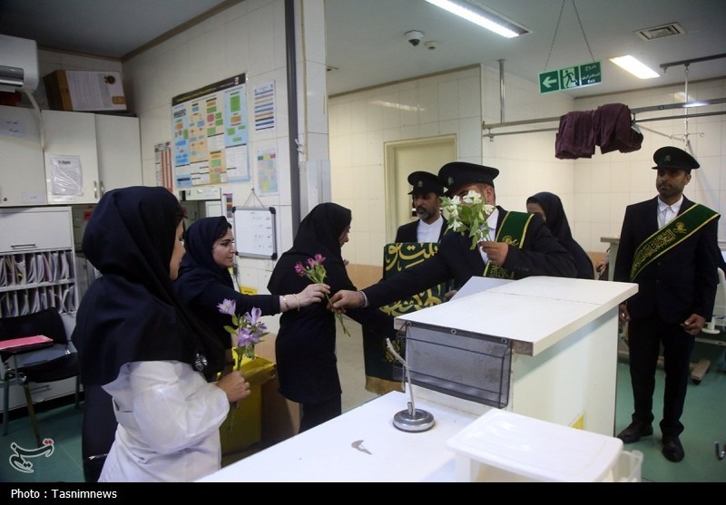 جمعی از خادمان حرم مطهر حضرت فاطمه معصومه)س( به همراه پرچم متبرک این آستان مقدس به مناسبت سالروز میلاد حضرت زینب کبری)س( و روز پرستار با حضور در بیمارستانهای قم با اهدای گل و توزیع کیک میلاد حضرت زینب)س( از پرستاران تقدیر کردند.