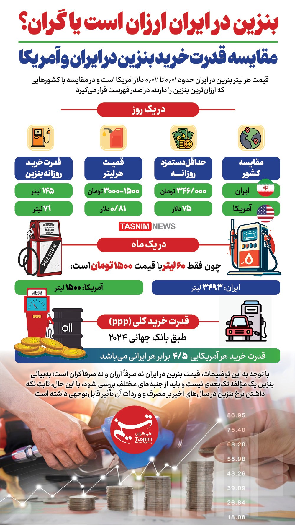 اینفوگرافیک/ بنزین در ایران ارزان است یا گران؟ / مقایسه قدرت خرید بنزین در ایران و آمریکا