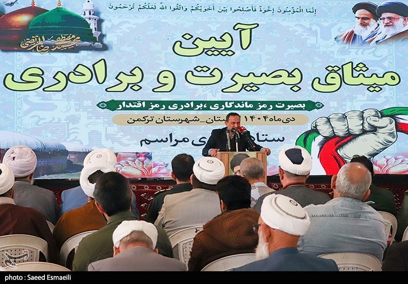 آیین میثاق بصیرت و برادری با حضور پرشور مردم، علما و مسئولین استان گلستان در بندر ترکمن برگزار شد. در این مراسم، حمیدرضا مقدمفر، مشاور فرمانده کل سپاه پاسداران انقلاب اسلامی، سخنرانی مبسوطی را با محوریت وحدت ملی، بصیرت و تحلیل رویدادهای اخیر منطقهای ارائه کرد.مشاور فرمانده کل سپاه با مروری بر جنگ 12 روزه، سه عامل اصلی پیروزی را «اتحاد مقدس و انسجام ملی»، «مدیریت و فرماندهی مستقیم مقام معظم رهبری» و «بصیرت و دشمنشناسی عمیق» برشمرد.
