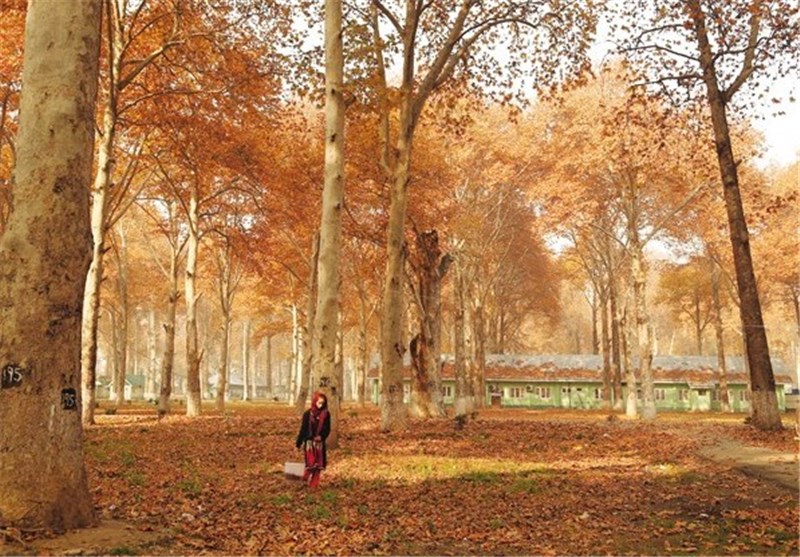 دختری که در زیر چناری تنومند در نزدیکی محل زندگیاش در دانشگاه کشمیر در سرینگر در حال قدم زدن است