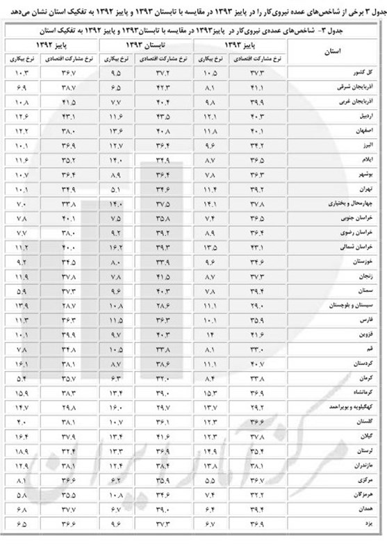 مقایسه نرخ بیکاری در 31 استان در پاییز 93 نسبت به تابستان 93 نشان می دهد، نرخ بیکاری در فصل گذشته در 15 استان کشور شامل آذربایجان شرقی، آذربایجان غربی، اردبیل، تهران، چهارمحال و بختیاری، خوزستان، زنجان، سیستان و بلوچستان، قزوین، کردستان، کرمان، کرمانشاه، گلستان، لرستان و مازندران افزایش یافته است.