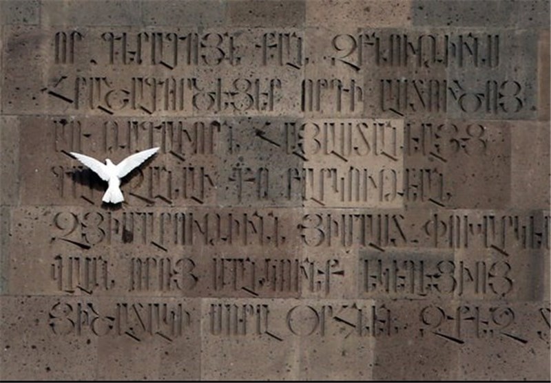پرنده ای که سعی دارد روی دیوار یک سنگ نوشته تاریخی در ارمنستان بنشیند. (AP)