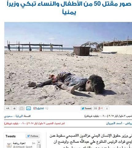 آن صحنه هولناک هیچ گاه از ذهن و خاطره مردم غزه و افکارعمومی جهان نمیرود، با این حال روزنامه الحیات به سوءاستفاده از اجساد تکه تکه شده کودکان شهید فلسطینی در غزه برای استفاده از آن در جنگ روانی و تبلیغاتی علیه جنبش انقلابی انصارالله یمن روی آورده است. این روزنامه یکی از تصاویر جنایات صهیونیستها را این گونه برای اهداف پست و شرم آور خود در خصوص یمن به کار برده و مدعی شده است:" تصاویر کشته شدن 50 نفر از کودکان و زنان،وزیر یمنی را به گریه انداخت" این رسانه سعودی مدعی شد که جنبش انصارالله،کودکان را در سواحل عدن به قتل میرساند تا به زعم خود جنبشی را که با حمایت مردم یمن علیه استبداد سعودی در یمن انقلاب کرده است، تخریب کند.