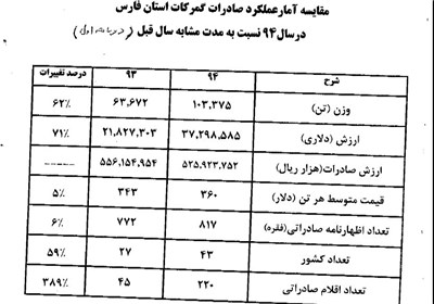 آمارها نشان میدهد سال گذشته 579 هزار و 514 تن کالا به ارزش 216 میلیون و 462 هزار دلار از طریق گمرکات استان فارس به خارج از کشور صادر شده است که از لحاظ وزن و ارزش به ترتیب 66 و 84 درصد محصولات صادراتی استان فارس را شامل میشود.