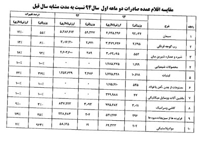 نکته حائز اهمیت در کالاهای صادراتی امسال صادرات محصولات شیمیایی، مصنوعات از چدن، آهن یا فولاد و ماشینآلات و وسایل مکانیکی است که در مدت مشابه سال گذشته هیچ گونه صادراتی نداشته است.