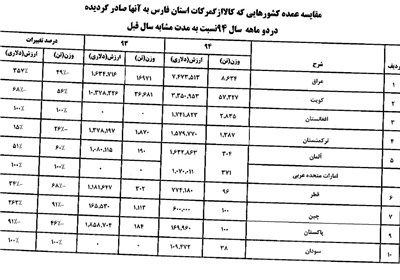 مقایسه عمده کشورهایی که کالا از گمرکات استان فارس به آنها صادر شده نشان میدهد در دو ماهه نخست امسال 8 هزار و 634 تن کالا به ارزش بیش از 7 میلیون دلار به کشور عراق صادر شده که نسبت به مدت مشابه سال گذشته از نظر ارزش دلاری رشد 375 درصدی داشته است.