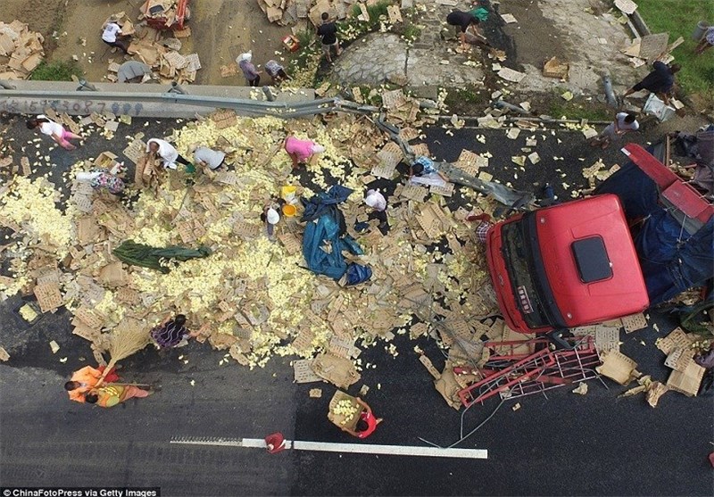پس از واژگونی یک کامیون در اتوبانی در چین، بیش از 10 هزار جوجه یک روزه آن توسط روستائیان محلی به غارت رفت.