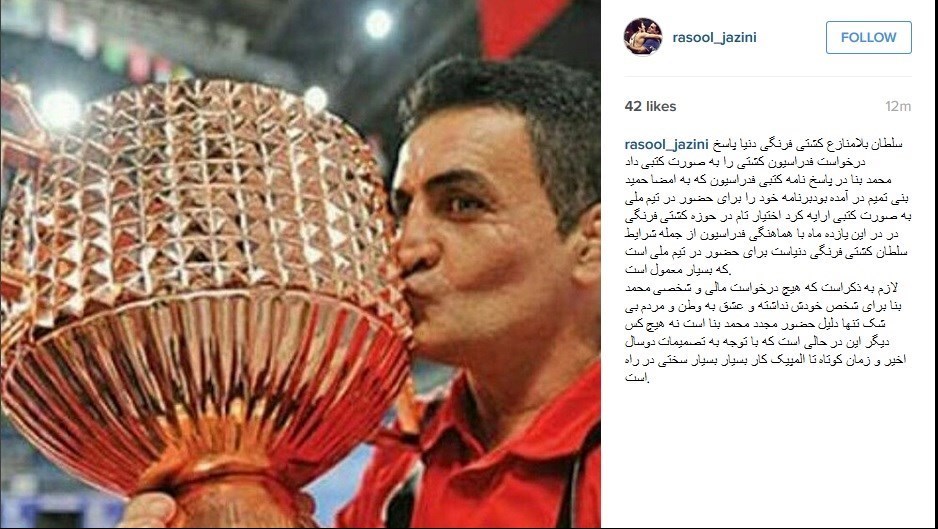 رسول جزینی با اعلام این خبر در صفحه اینستاگرامش نوشت: محمد بنا در پاسخ نامه کتبی فدراسیون که به امضای حمید بنیتمیم در آمده بود، برنامه خود را برای حضور در تیم ملی به صورت کتبی ارائه کرد. اختیار تام در حوزه کشتی فرنگی در این یازده ماه با هماهنگی فدراسیون و دعوت از 36 نفر از کشتیگیران برای اردو آمادهسازی از دوازده مهر از جمله شرایط سلطان کشتی فرنگی دنیا برای حضور در تیم ملی است که بسیار معمول است.