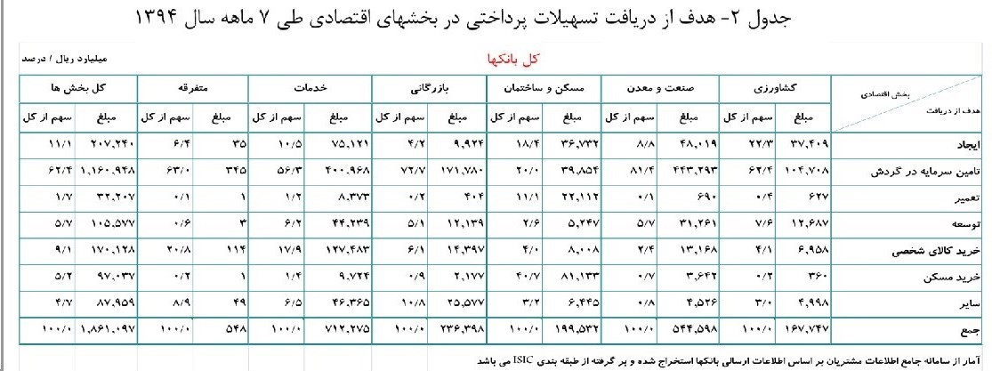 همچنین سهم تسهیلات پرداختی در قالب سرمایه در گردش در کلیه بخشهای اقتصادی طی 7 ماهه سال جاری مبلغ 1160.9 هزار میلیارد ریال معادل 62.4 درصد کل تسهیلات پرداختی میباشد که در مقایسه با 7 ماهه سال گذشته مبلغ 101.0 هزار میلیارد ریال معادل 9.5 درصد افزایش داشته است.
