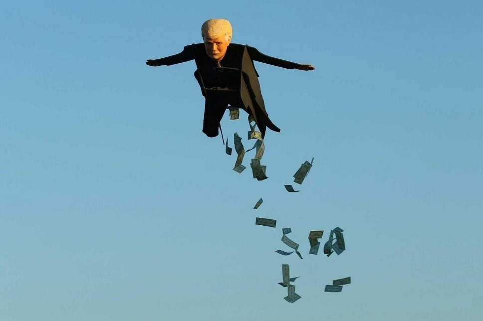 بر اساس گزارش ایندیپندنت، هواپیمای کنترل از راه دور وی، ترامپ را در حال انتشار پولهای تقلبی نشان میدهد.