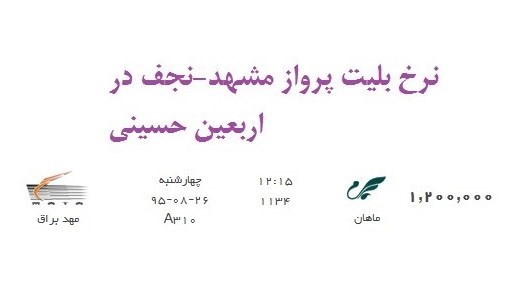 همچنین نرخ بلیت پرواز مشهد-نجف برای روز 26 آبانماه (چهارشنبه) یک میلیون و 200 هزار تومان است. قیمت بلیت برگشت این مسیر نیز برای روزهای اول آذرماه در حال حاضر یک میلیون و 250 هزار تومان است.