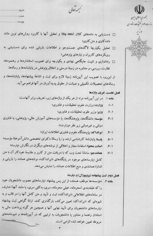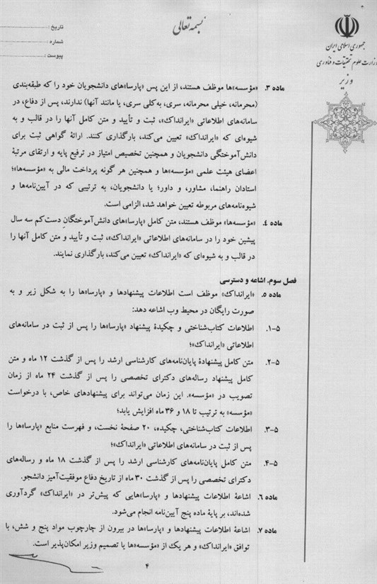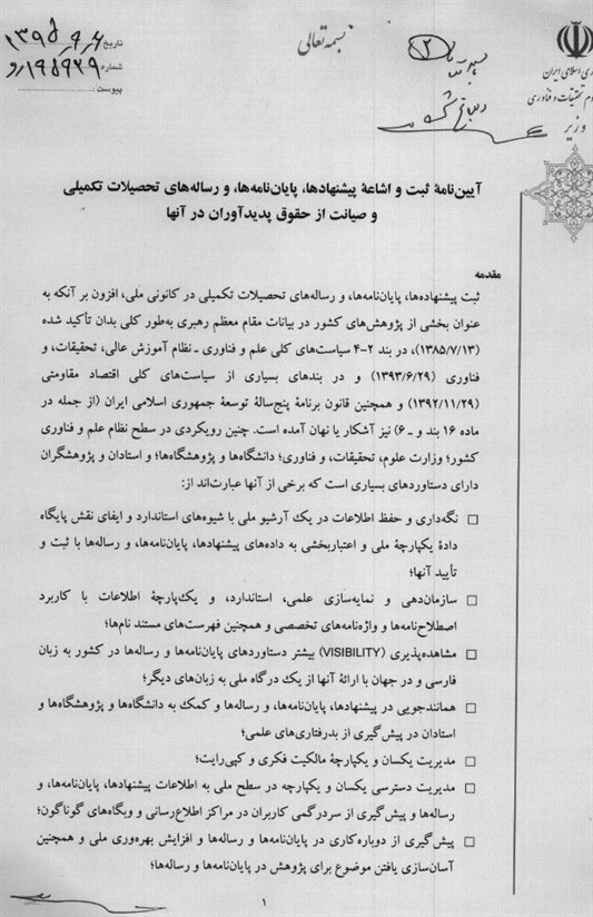 این کار که در راستای آییننامه ابلاغی وزارت علوم با موضوع "ثبت و اشاعه پیشنهادها، پایاننامهها و رسالههای تحصیلات تکمیلی و صیانت از حقوق پدیدآورندگان در آنها" صورت گرفته اشاعه اطلاعات و فایل تمام متن پایاننامهها و رسالهها را فراهم میکند.