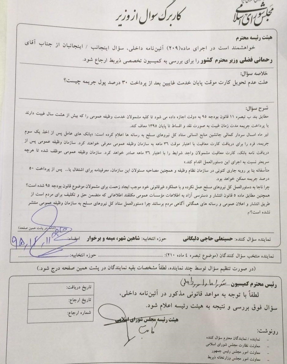 وی با بیان اینکه اداره وظیفه عمومی نیروی انتظامی در این راستا دچار تخلف شده است، گفت: این اداره بیان میکند که بعد از اینکه "یک دوم جریمه" موردنظر پرداخت شد افراد میتوانند کارت پایان خدمت موقت خود را دریافت کنند. این موضوع خلاف دستورالعملی است که ستاد کل نیروهای مسلح صادر کرده و از این بابت از وزیر کشور سئوال کردم که چرا چنین اتفاقی در نیروی انتظامی افتاده است.